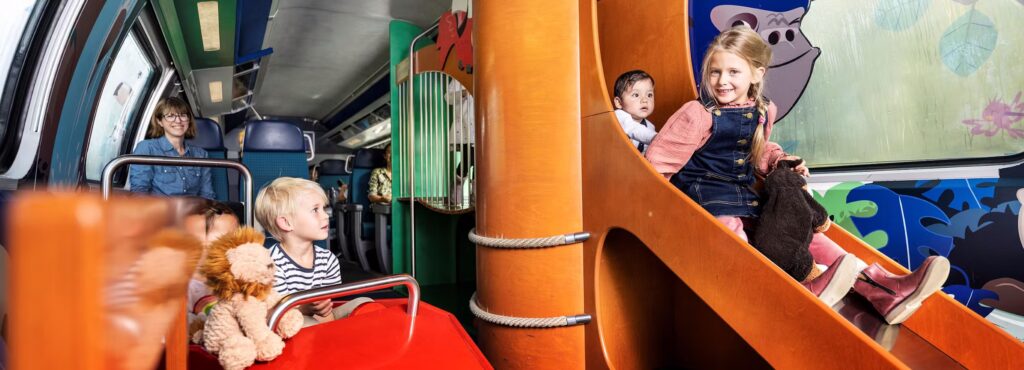 À l’étage supérieur de la voiture de commande, une zone ludique décorée de dragons 🐉 ou d’animaux de la jungle 🐒 attend les enfants.